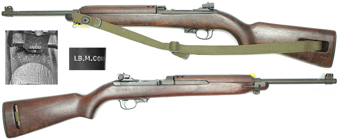 U.S.A. Model M1 Carbine semiautomatic rifle # 3938166 (.30 Carbine) mfg. by International Business Machines in Early 1944 with undated I.B.M. CORP. marked barrel. Excellent condition, metal has mostly full Parkerized finish with a mirror bright bore and with 1.5 muzzle-wear. This features a round-topped bolt, push-button safety, adjustable rear sight and early front band without bayonet-lug. Low-wood walnut stock and handguard has very few minor dings and handling marks. Includes one 15-round unmarked magazine (only where legal) with web sling and oiler. Not import-marked. PHOTOS . . . $1750. C&R SOLD