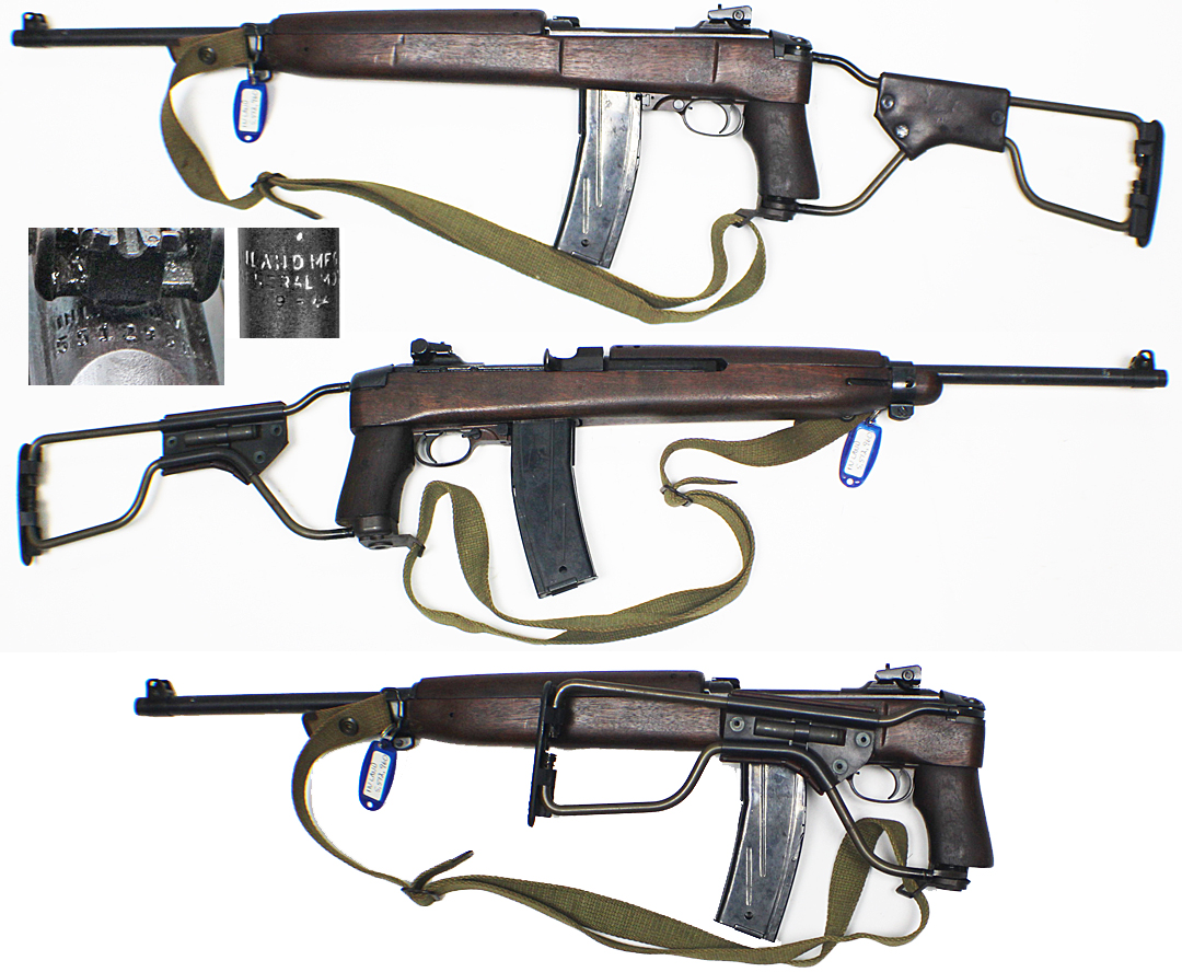 U.S.A. Model M1 Carbine semiautomatic rifle in the M1A1 paratrooper configuration # 5512960 (.30 Carbine) mfg. by Inland in Late 1944 with 9-44 dated Inland barrel. Excellent condition, metal has mostly full Parkerized finish with a mirror bright bore and with 1.0 muzzle-wear. This features a round-topped bolt, flip-type safety, M-marked magazine release, adjustable rear sight and early front band without bayonet lug. This carbine action has been fitted into what we believe to be a reproduction paratroop folding stock with web sling and oiler (the owner believed it to be original). Includes one 30-round unmarked magazine (only where legal). Not import-marked with CMP certificate of authenticity. PHOTOS . . . $1950. C&R SOLD