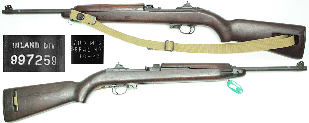 U.S.A. Model M1 Carbine semiautomatic rifle # 997259 (.30 Carbine) mfg. by Inland Division of General Motors in Late 1943 with 10-43 dated Inland barrel. Excellent condition, metal has mostly full Parkerized finish with a mirror bright bore and with 2.0 muzzle-wear. Early configuration, featuring a flat-topped bolt, push-button safety, L-shaped flip rear sight and early front band without bayonet-lug. High-wood walnut stock and handguard has only a few minor handling marks. Includes one 15-round unmarked magazine (only where legal) and a web sling with oiler. Not import-marked with CMP certificate of authenticity. PHOTOS . . . $1675. C&R SOLDU.S.A. Model M1 Carbine semiautomatic rifle # 1751153 (.30 Carbine) mfg. by Rock-Ola in Late 1943 with undated Rock-Ola barrel. Excellent condition, metal has mostly full Parkerized finish with a mirror bright bore and with 2.5 muzzle-wear. This features a flat-topped bolt, flip-type safety, M-marked magazine release, adjustable rear sight and late front band with bayonet-lug. High-wood walnut stock and handguard has very few (if any) handling marks. Includes one 30-round unmarked magazine (only where legal) with web sling and oiler. Not import-marked with CMP certificate of authenticity. PHOTOS . . . $1500. C&R SOLD