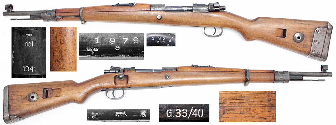 GERMAN Model 33/40 Mauser bolt-action "mountain carbine" # 1979a (8mm) mfg. by Brno Arms Factory (Waffen Werke Brunn, code dot) in 1941 with a mere 19.6" barrel. A Very Good condition original example with very sharp and distinct markings and 70% or so original mottled bluing. All-correct and fully matching and a very strong and bright bore. Sound solid wood buttstock with metal kickplate. Includes cleaning-rod and front sight-hood, rear barrel band held together with incorrect bolt. Rare, only about 50,000 of these were produced at Brno 1941-1943). Not import-marked. PHOTOS . . . $2950. C&R SOLD
