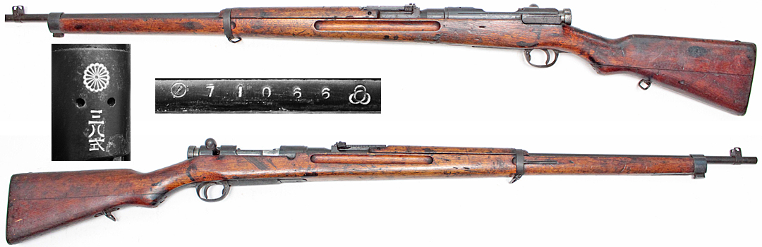 JAPANESE Type 38 Arisaka bolt-action rifle Series 26, # 71066 (6.5x50mm) mfg. at Kokura from December 1940 to September 1941. Near Excellent condition with full original bluing (some old pitting on triggerguard, magazine floorplate and back of bolt. Has intact mum. No matching serial numbers. This type has ladder V-type rear sight and front sight with "ears", missing its cleaning rod. Bore is a bit dark but with very strong rifling. Wood has many handling marks and has stains that look a lot like blood. Not import marked. PHOTO . . . $575.* C&R SOLD