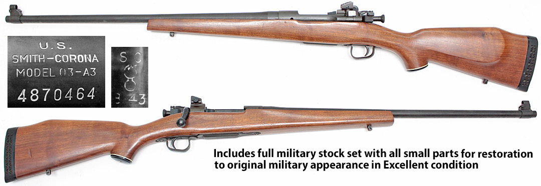 U.S.A. Model 03-A3 Springfield bolt-action rifle # 4870464 (.30-06), receiver mfg. by Smith-Corona in August 1943 with SC 8-43 barrel. Excellent condition with 90% Parkerizing on all metal. Bore is mirror-bright and very strong (gauges TE = 1.5, MW = 1.5) with 6-groove rifling. Rifle is currently in a SUPREME sporter stock, but an excellent military stock and handguard (with all accessories) is also included. Not import-marked. PHOTOS . . . $950. C&R SOLD
