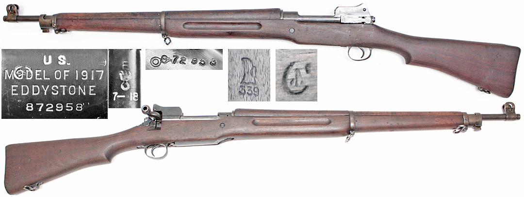 U.S.A. Model of 1917 bolt-action infantry rifle # 872958 (.30-06) mfg. by Eddystone in July 1918 with a 7-18 dated Eddystone barrel. Bolt made by Winchester, buttstock made by Remington. Excellent condition with 95% Parkerized finish on metal and a very strong and somewhat bright bore. Walnut stock has very few handling marks, has arrow inside C stamped on right side and atop chamber (indicating its issue to Canadian service). Top of bolt handle serial numbered to match (another Canadian practice, as these bolts were not originally numbered at all). PHOTOS . . . $1275. C&R SOLD