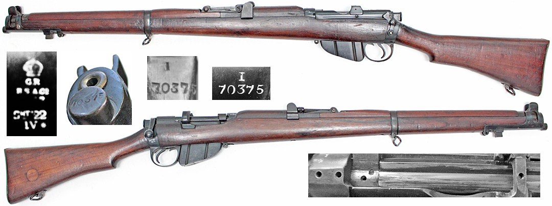 BRITISH Enfield Sht '22 Mk.IV* bolt-action single-shot training rifle # I70375 (.22 Long Rifle) mfg. by Birmingham Small Arms in 1918, converted in 1940 with new .22LR barrel. Excellent condition, with full remaining oil-blacked finish and a mirror bright bore. Top flats of receiver have been drilled and tapped for scope mounting (which is not present). Bolt not matching (not uncommon for these, as they were converted from No.1 Mk.III rifles). Magazine has no spring or follower. Wood has original finish with very few handling marks, both forend and butt as well as nose cap and magazine are stamped to match barrel. Has usual arsenal repairs at heel. Not import-marked. PHOTOS . . . $775. C&R SOLD