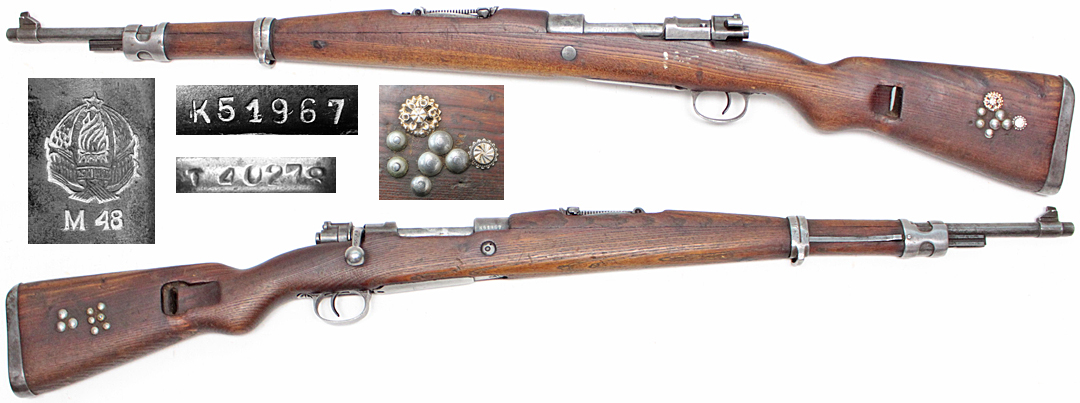 YUGOSLAVIAN Model 48 Mauser bolt-action rifle # K51967 (8mm) mfg. by Zastava in 1951. Good to Very Good condition, a large-ring intermediate-length Mauser with very little remaining bluing and a mostly bright (if a bit worn) bore. Bold Tito-era crest above chamber, bolt not matching, but every other numbered part does. This rifle has the look of a relic of the Balkan wars, complete with several ornamental tacks driven in both sides of the stock. No cleaning-rod or front sight-hood, fully operational. PHOTOS . . . $275. C&R SOLD