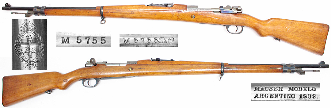 ARGENTINE Model 1909 Mauser bolt-action rifle # M5755 (7.65x54) mfg. by DWM in 1911. Excellent condition, with 95% bluing on all parts (receiver in the white as it should be). National Crest above chamber very bold, all-matching serial numbers. Bore is very strong and mirror-bright. Walnut stock and handguard has original finish with some handling marks. PHOTOS . . . $825.* C&R SOLD