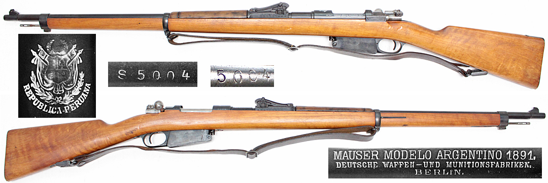 PERUVIAN Model 1891 Mauser bolt-action infantry rifle # S5004 (7.65x54) mfg. by DWM in 1899 with a 29 1/2" barrel (manufactured by S.I.G. in Switzerland). Excellent condition, with 95% original bluing and an excellent mirror-bright bore. Features a lange-vizer (rollercoaster) rear-sight (like the German Gewehr 98), crest atop chamber very strong for these, bolt stamped 5004 (matching). Plain walnut stock is quite lovely, includes cleaning rod. Not import-marked, scarce (especially this nice) PHOTOS . . . $875.* C&R SOLD