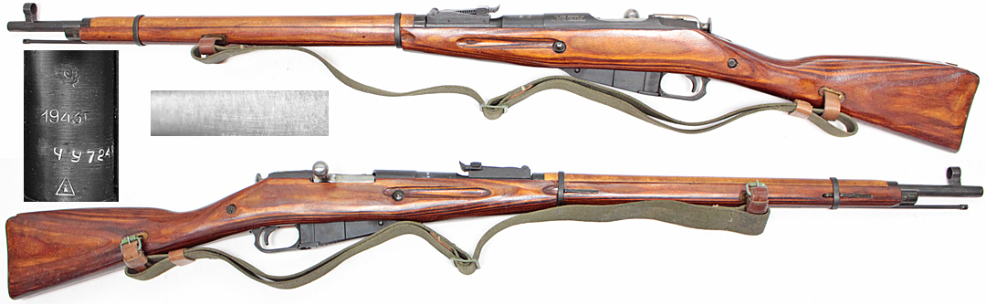 SOVIET Model 91/30 Mosin-Nagant bolt-action rifle # UY7248 (7.62x54R), mfg. by Izhevsk in 1943 on a round receiver. Excellent-PLUS arsenal refinished condition, with 98% or better bluing on all metal parts. All matching inscribed serial numbers (including letter prefixes), bolt number extremely faint. Bore is mirror-bright (has NOT been counterbored at muzzle). Buttstock and handguard has a few very minor handling marks. Includes cleaning rod and correct web sling with leather "dog collar" swivels. PHOTOS . . . $350.* C&R SOLD