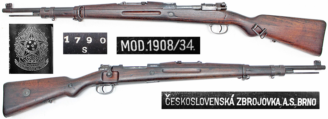 BRAZILIAN Model 1908/34 Mauser bolt-action cavalry carbine # 1790s (7x57) mfg. by Ceskoslovenska Zbrojovka A.S., Brno (CZ) in c.1935. Very Good or better condition, with browning full-coverage bluing. Bore is a bit rough with strong rifling, Brazilian crest is extremely bold and beautiful. Turned-down bolt is not numbered, but is of proper type and headspaces properly complete with cleaning-rod. Stock and handguard are of very dark walnut. This is a rarely encountered contract, not listed in either edition of Ball. PHOTOS . . . $675. C&R SOLD
