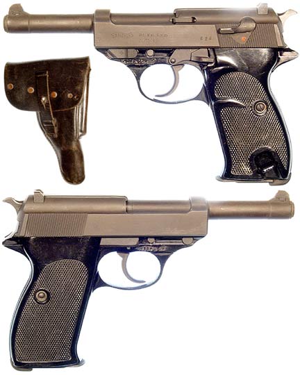 GERMAN Model P1 semiautomatic pistol # 019626 (9mm) mfg. by Walther in August 1979. Excellent-PLUS condition having virtually no apparent wear with mirror-perfect bore and chamber. This is the modernized version of the Walther P38 with an alloy-frame. Original black grips, one magazine with slightly-used black-leather full-flap holster and original test-target. . . PHOTOS . $275. SOLD
