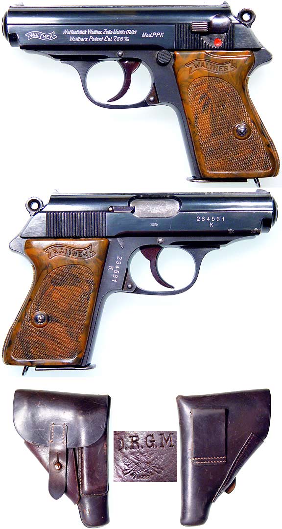 GERMAN Model PPK Walther semiautomatic pistol # 234531K (.32 ACP) mfg. at Mauser in c.1938. Excellent PLUS condition, retains over 99% bluing with gorgeous high-polish finish to metal and perfect mirror-bright bore, tiny amount of specking on bottom right side of slide keeping this from being graded PERFECT. A commercial model PPK with crown over N proofmarks. Original mottled-brown plastic grips, includes undated D.R.G.M. marked Akah-code (Albrecht Kind) breakaway full-flap dark-burgundy leather holster with spare magazine, both in VG+ condition. Not import-marked, an absolutely GORGEOUS rig. PHOTOS . . . $950. C&R SOLD