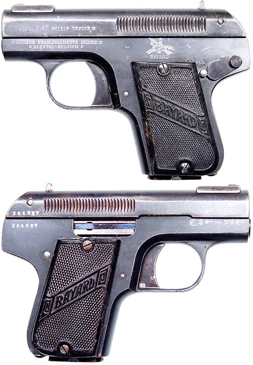 BELGIAN Model 1908 Bayard semiautomatic pistol # 261387 (.32 ACP), mfg. by Pieper circa 1920. Excellent condition, with 95% original bluing, Belgian postwar proofs on right side. Bore a little pitted but strong, all matching-numbers. This was the smallest pistol ever officially adopted by any army, and were issued by Belgium both during and after WWI. Nice black-rubber grips marked BAYARD, Adamek, "Pistols of World War I", page 110. Not import-marked. PHOTOS . . . $325. C&R SOLD