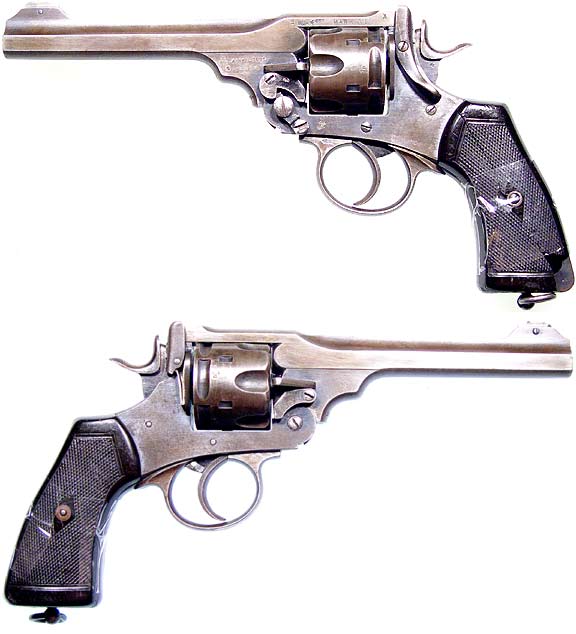 BRITISH Mark VI revolver # 333276 (converted to .45 ACP) mfg. by Webley & Son in 1918 with 6" barrel. Very Good condition, with 85% bluing beginning to turn brown and only a few of the expected handling marks. All-matching numbers, very tight lock-up, with an Excellent, mirror-bright bore and chambers. Left bakelite grip shattered (pieces held together with tape), right grip slightly chipped at bottom. PHOTOS . . . $425. C&R