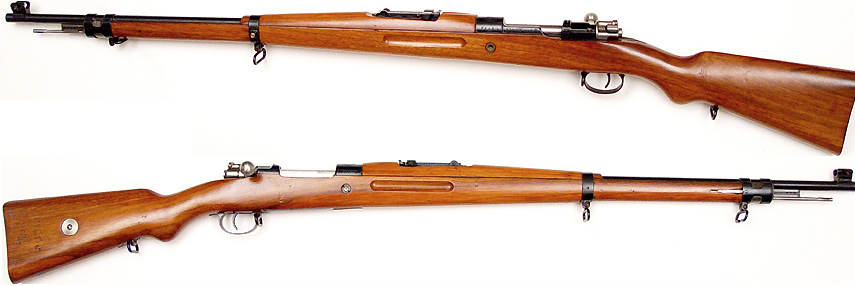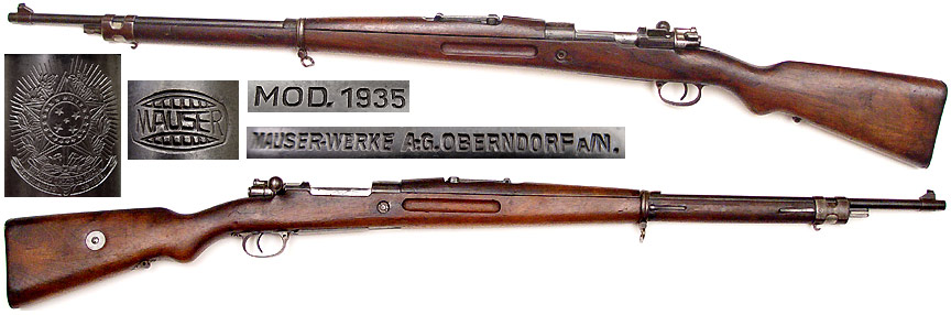 BRAZILIAN Model 1935 Mauser bolt-action long rifle # 4028 (7x57) mfg. by Mauser in 1936. Near Excellent condition with 95% bluing and all-matching numbers. Bright and strong bore and fantastic detailed Brazilian crest above chamber. Nice walnut stock was likely refinished long ago with only a couple scuffs since, front of handguard split with small piece of wood missing. Scarce, not import-marked, no cleaning-rod. PHOTOS . . . $350. C&R SOLD
