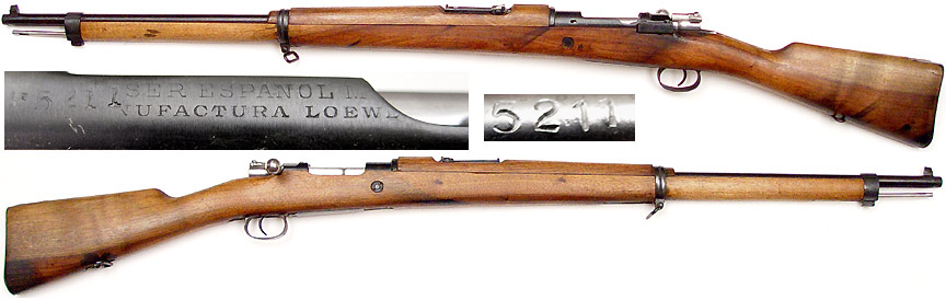SPANISH Model 1893 Mauser bolt-action rifle # 5211 (7x57) mfg. by Loewe (undated, circa 1896). Excellent condition, all bluing intact except for some bare areas on triggerguard. A Spanish Army rework, left side of receiver cut for thumb, no crest above chamber, obviously renumbered with matching-numbered bolt. Has a near-excellent very bright bore and is completely functional. Wood has original finish with virtually no handling-marks. Not import-marked. PHOTOS . . . $375. Antique, no FFL required SOLD