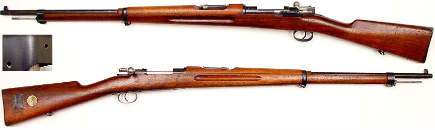 SWEDISH Model 96 Mauser bolt-action rifle # 54226 (6.5x55), mfg. by Waffenfabrik Mauser in 1900. Excellent condition, with 95% or more intact bluing. Has a sharp bright bore (bore-disc indicating 6.51/3). All-matching numbers except for rear-sight and buttplate, rear of receiver drilled & tapped for target sights. Walnut stock & handguard has nice grain original finish with a few handling-marks and compressions but is sound, metal range-plate tacked on right side. PHOTOS . . . $250. C&R SOLD
