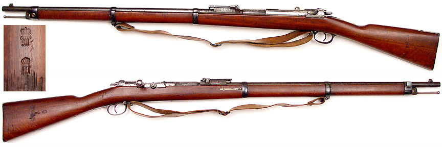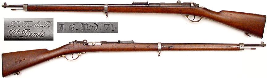 URUGUAY Model 1871 Mauser bolt-action single-shot long rifle # 90185 (6.5x53.5SR Deaudetau) mfg. by Mauser in 1878 as a 11mm Carbine and converted at St. Denis to the Deaudetau caliber (also known as the DOVITIIS conversion). Near Excellent condition, with some mottling of metal (originally "in the white") from age, a little wear from mounting and removing bayonet. Bolt (and all bolt parts) numbered 90185, mounting-bolts not matching. Bore is absolutely gorgeous, mirror-bright all the way to muzzle with strong rifling. Wood is walnut with its original finish (cartouches clear) having only a few dings and handling-marks and some minor losses, cleaning-rod in channel on left side of stock, totally functional. PHOTOS . . . $575. Antique, no FFL required