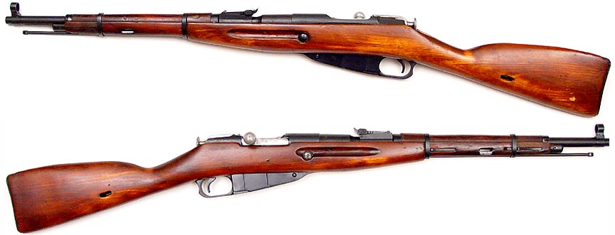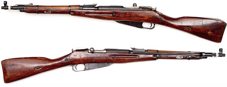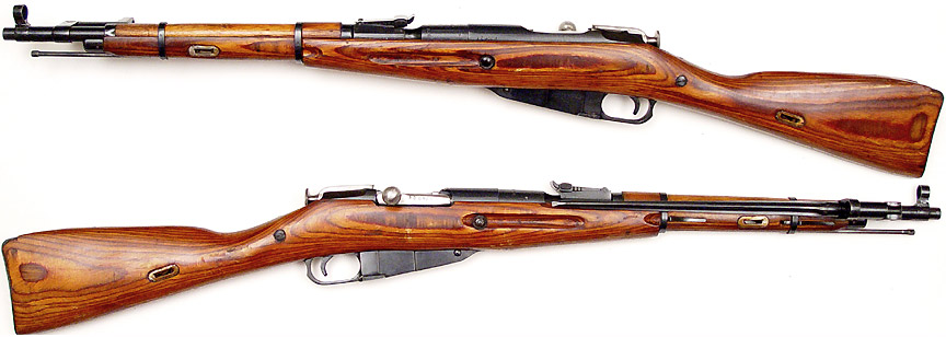 RUSSIAN Model 44 Mosin-Nagant bolt-action carbine # AT4005 (7.62x54R), mfg. by Izhevsk in 1944. Excellent PLUS condition, metal has 99% original bluing and an excellent mirror-bright bore. All-matching stamped numbers throughout. Laminated stock is virtually like new with a few minor scrapes on shellac finish. A very pretty example. PHOTOS . . . $150. C&R SOLD