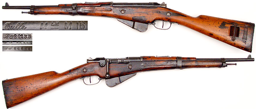 FRENCH Model 1916 Berthier bolt-action musketoon # BC86135 (8x50R Lebel), mfg. by Tulle in 1916, barrel mfg. at Chatellerault in 1924 with 20.12" barrel. Very Good condition, N-marked chamber, all matching numbers except for stock, slightly rough but strong bore. Stock has oil-stains, missing front sling-swivel, else sound and fully capable of firing. Includes 5-round en-bloc clip. Not import-marked. PHOTOS . . . $225. C&R SOLD