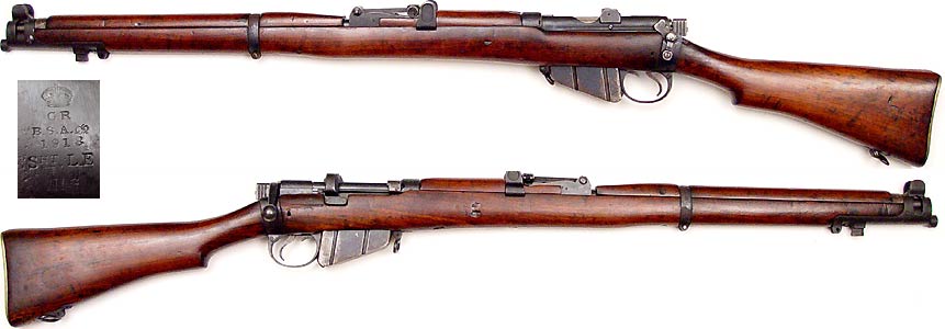 BRITISH No.1 Mk.III bolt-action rifle # H96993 (.303 British) mfg. by Birmingham Small Arms in 1918. Very Good condition with slightly rough but strong bore. All-matching numbers, magazine cut-off slot is present but cutoff lever is not. Buttstock has wooden-plug where unit-disk used to be and an arsenal repair on right side near bolt. Some of the expected handling-marks and scratches on wood. PHOTOS . . . $275. C&R SOLD