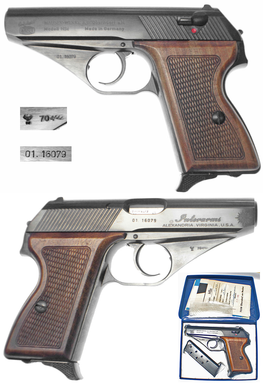 GERMAN Model HSc semiautomatic pistol # 01.16079 (.380 ACP), mfg. by Mauser, Oberndorf in 1970. Literally UNISSUED condition with 100% original bluing. An Interarms import, NEW IN BOX containing Mauser test-target (dated 21 SEP 1970) plus users manual and two magazines (one with fingergrip at bottom). PHOTO . . . $850. C&R SOLD