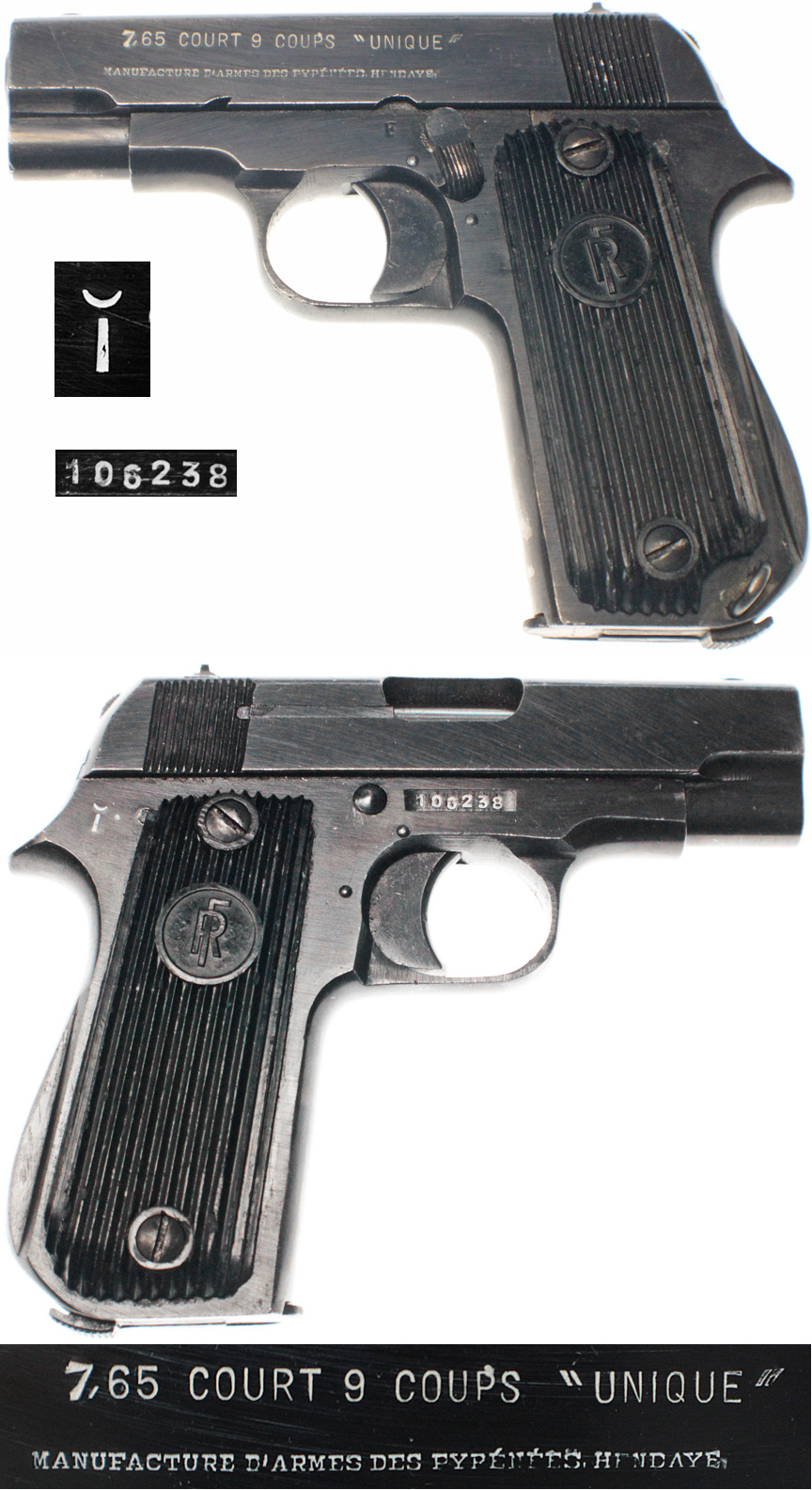 MOROCCAN Model RR51 "Unique" semiautomatic pistol # 106238 (.32 ACP) mfg. just after WWII by Manufacture d'Armes des Pyrénées, Hendaye. Basically a pistol of the time-tested "Ruby" design with exposed hammer. Excellent condition with 95% blued finish and a mostly bright bore. Moroccan "palm tree" property mark on right side of frame with Black-plastic RF-logo grips. Extremely smooth functioning, includes one 9-round magazine. Not import-marked. PHOTOS . . . $575. C&R
