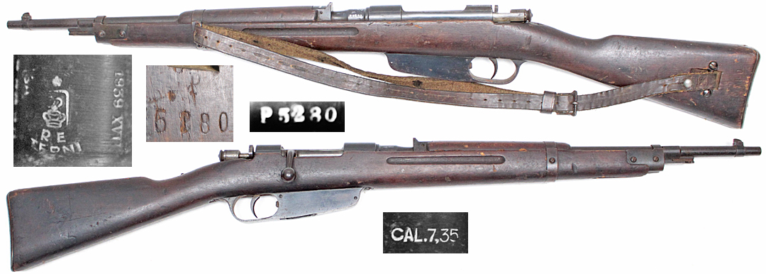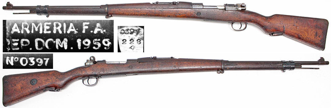 DOMINICAN REPUBLIC Model 1953 Mauser bolt-action infantry rifle # 0397 (7x57mm), mfg. in 1959. Very Good or so condition, with 80% or better faded and browned bluing on all metal parts. Has very strong markings and a very bright and strong bore. Brazilian Mauser bolt has been inscribed 0397 to match (no other parts are numbered on these), walnut stock & handguard has considerable handling marks including some minor loss of wood on right side of receiver. Not import-marked, very scarce in original 7mm (most were later rechambered to .30-06). Very scarce. PHOTOS . . . $650.* C&R SOLDFINN Model 38 Mannlicher-Carcano bolt-action short rifle # P5280 (7.35x53 Carcano) mfg. by Terni in 1939 with [SA] Finn markings.
