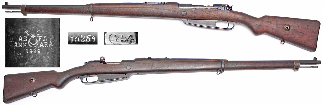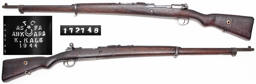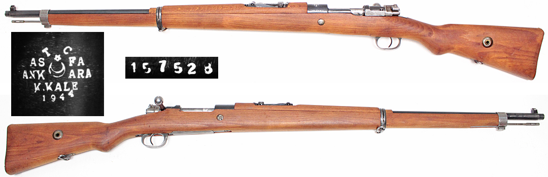 TURKISH Model 1903 Mauser bolt-action infantry rifle # 24482 (8x57) reconfigured by Ankara arsenal in 1937, a large-ring Mauser with straight plum-handled bolt. Very Good condition, with most browned bluing remaining. Rear sight has Arabic numerals and has rare MATCHING BOLT (# 482). Bore is somewhat bright and very strong, completely functional, includes cleaning-rod and worn leather sling tied on with leather thongs. Stock is tigerstriped walnut that could use a good cleaning with many handling marks. PHOTOS . . . $600.* C&R