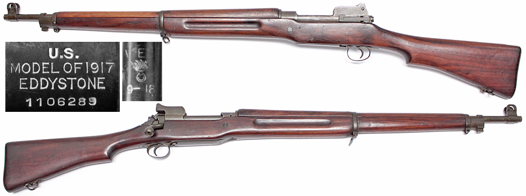 U.S.A. Model of 1917 bolt-action infantry rifle # 1106289 (.30-06) mfg. by Eddystone in September 1918 with a E 9-18 barrel. Bolt made by Eddystone, stock marked R (for Remington). Very Good condition with 70% Parkerized finish on metal and a very strong and mostly bright bore (gauges TE = 2.0, MW = 1.0) . Walnut stock has a few handling marks. Not import marked PHOTOS . . . $975.* C&R SOLD