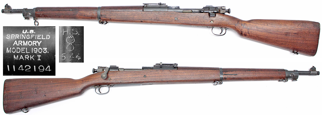 U.S.A. Model 1903 Mark I Springfield bolt-action rifle # 1142194 (.30-06) mfg. by Springfield Armory in late 1919. Excellent condition with 98% deep bluing on all metal. A very nice example with bright and strong 5-44 dated HS (High Standard) four-groove replacement barrel. Bore looks new and is mirror-bright (TE = 2.5, MW = 1.5), Nice walnut stock has very few dings and very little evidence of actual use, last four digits of serial number (2194) stamped on right side. Not import marked, with CMP certificate of authenticity. A very lovely high-grade example, with much thick cosmoline remaining. PHOTOS . . . $1250. C&R SOLD