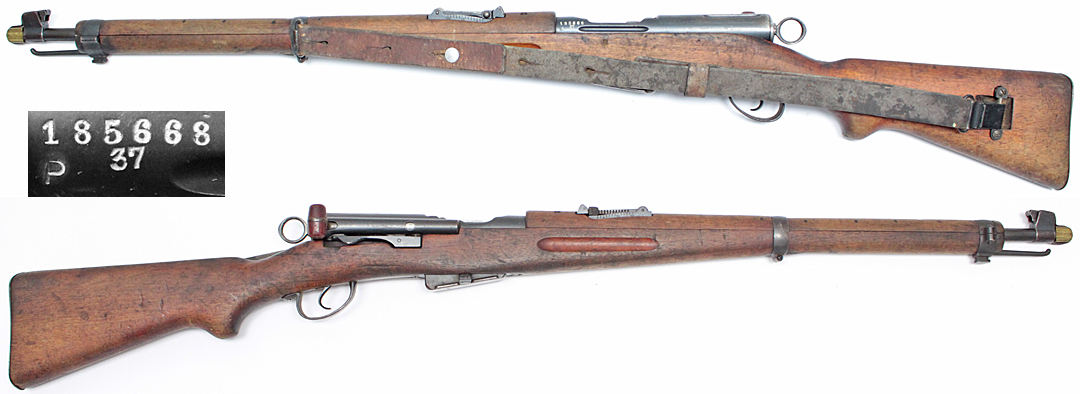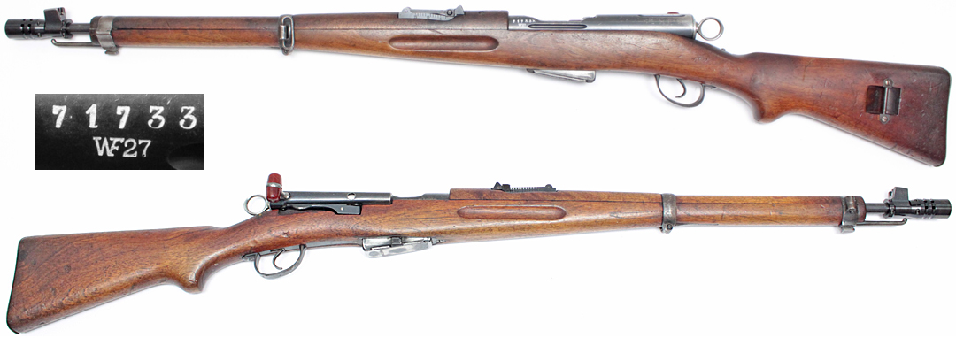 SWISS Model K-11 Schmidt-Rubin cavalry carbine # 185668 (7.5x55mm) mfg. by Waffenfabrik Bern in 1930 and privatized in 1937.. All-matching serial numbers except magazine (which is from a G11). Very Good condition with 75% bluing remaining (much less on magazine) and a shiny and strong bore. Walnut stock and handguard has original finish with many of the usual scuffs and handling marks and a repair on right side of tang. Has soldier's tag beneath buttplate as well as brass and steel muzzle-cap and worn leather sling. Not import marked. PHOTO . . . $425. C&R