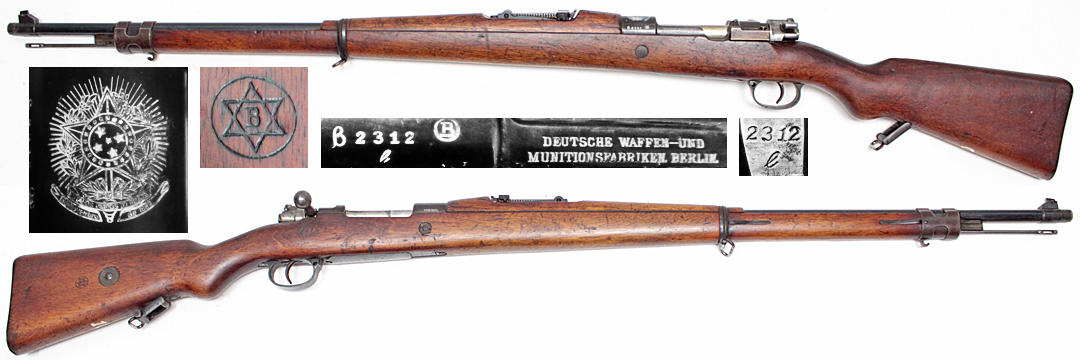 BRAZILIAN Model 1908 Mauser bolt-action rifle # 2312e (7x57mm) mfg. by DWM Berlin in c.1909. Near Excellent condition, with 90% bluing (receiver in also blued), bore is bright and strong. All matching serial numbers, Brazilian-crest above chamber very strong and bold. Walnut stock and handguard has some handling marks and scratches with original finish and razor-sharp Star of David cartouche. Includes cleaning-rod and quick-detach rear swivel. Not import-marked. PHOTOS . . . . $650.* C&R SOLD