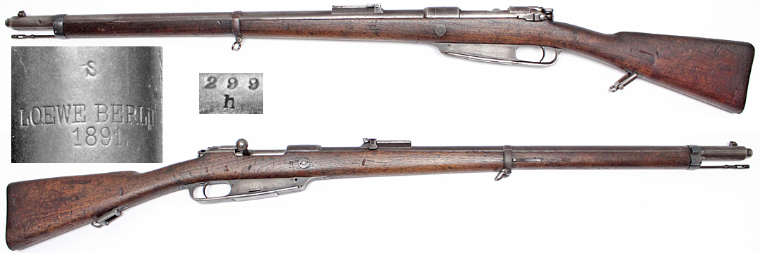 GERMAN Model Gewehr 88/15 bolt-action Commission rifle # 299h (8x57i) mfg. by Loewe in 1891. Very Good condition, with 75% thinning and browning bluing. No matching serial numbers (as usual), no signs of Turkish usage. Excellent bright and strong bore (marked with S), still retains its (slightly dented) barrel-jacket. Includes cleaning rod and detachable rear sling swivel, decent walnut stock which has a small ding (with very small loss of wood) on left forend.