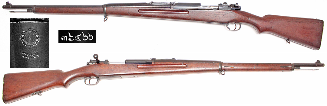 SIAMESE Model 1903 Mauser bolt-action rifle # 36466 (8x56R Siamese), mfg. by Koishikawa Arsenal (Japan) in 1903 with straight-bolt. Excellent or better condition, with 95% or better original bluing on all parts. Includes sliding action-cover and cleaning rod, ramp of rear sight has been ground down to accommodate the rechambering from 8x52R. Bore is mirror bright with strong rifling. Walnut stock and handguard has very few minor handling-marks (expected after 120+ years). Not import-marked, extremely nice for these. PHOTOS . . . $625. C&R