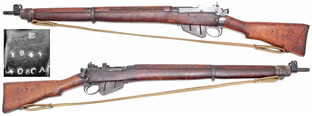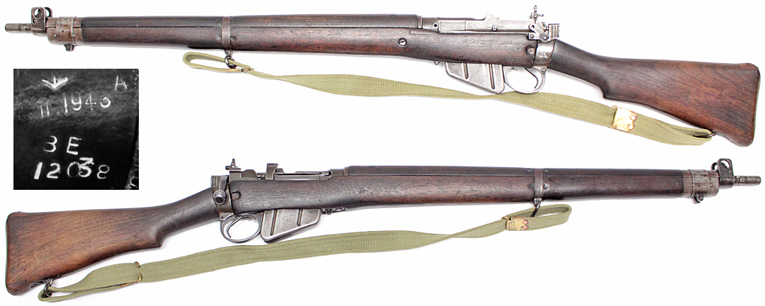 BRITISH Enfield No.4 Mk.1 bolt-action rifle # 4080A (.303 British) mfg. by BSA Shirley in 1941. Very Good condition, with bright and strong 4-groove bore, full bluing on receiver and barrel, magazine and barrel-bands heavily browned from contact with sweaty palms. All serialized parts are matching (bolt handle & bottom of magazine), no other parts are numbered. Features L-shaped flip rear sight, wood has some scuffs and dings with repair to heel and neat grooved rear handguard. Includes correct green web sling (secured on ftront band). Not import-marked. PHOTOS . . . $495. C&R SOLD