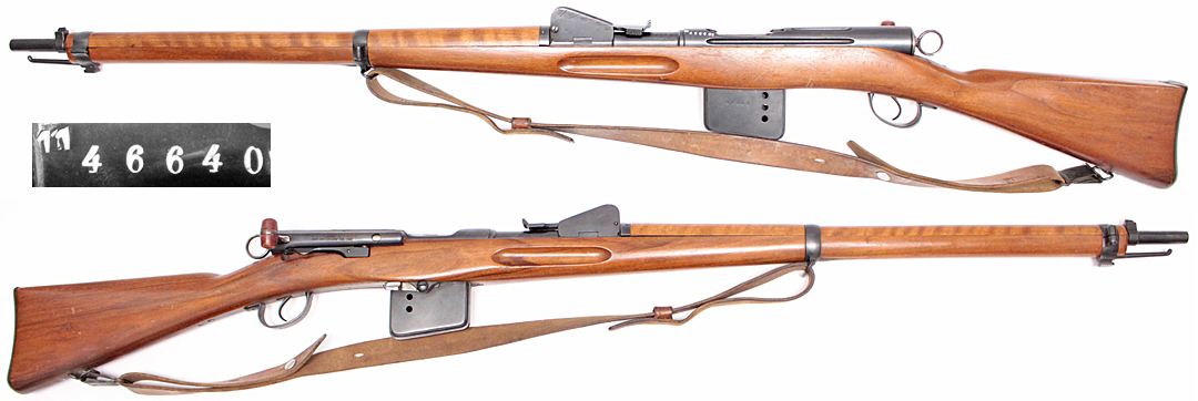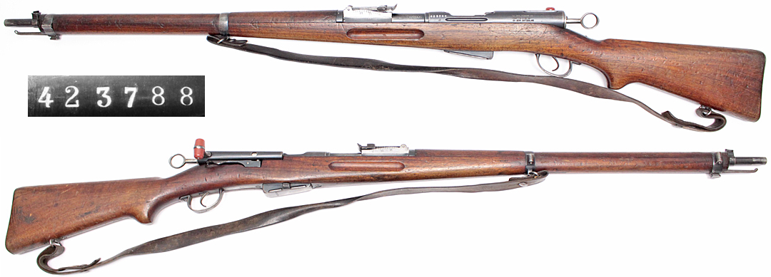 SWISS Model 1889 Schmidt-Rubin infantry rifle # 46640 (7.5x53.5mm, chambered for the GP90 round) mfg. by Waffenfabrik Bern in 1892. All-matching serial numbers including 12-round magazine. Excellent condition, with around 95% bluing. Bore is very strong and mirror-bright, walnut stock and tigerstriped handguard has original finish and has only a couple minor scrapes and handling marks. Includes leather sling. PHOTO . . . $475.* Antique, no FFL required SOLD