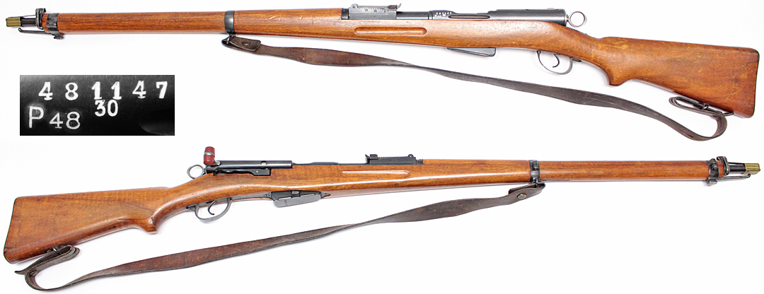 SWISS Model G1911 Schmidt-Rubin infantry rifle # 481147 (7.5x55mm) mfg. by Waffenfabrik Bern in 1919 (last year of issue) and privatized in 1930 and 1948. All-matching serial numbers including magazine. Excellent condition with 95% bluing remaining and a near-perfect mirror-bore. Walnut stock and handguard has original finish with very few of the usual scuffs and handling marks. Incudes leather sling and brass & steel muzzle cover. PHOTO . . . $475.* C&R SOLD