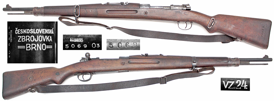 CZECH Model vz24 Mauser bolt-action short-rifle # 5069 O3 (8x57) mfg. by CZ in 1935. Very Good or netter condition with 3-line factory address atop chamber. Full external bluing has some patina from age. The bore is quite strong and mostly bright, all matching serial numbers on every numbered part. Includes cleaning-rod and black leather sling with rectangular buckle, walnut buttstock and handguard have been lightly sanded sometime in the distant past. Not import-marked. PHOTO . . . $525. C&R SOLD