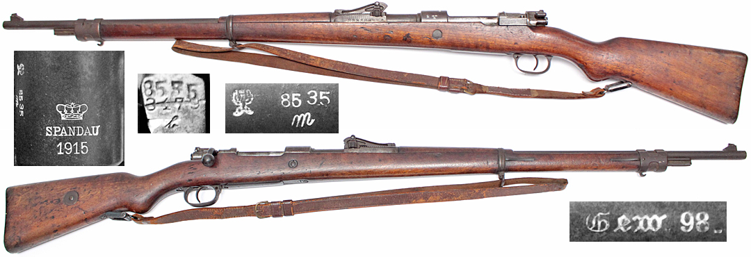 Not import-marked. PHOTO . . . $375.* Antique, no FFL needed SOLDGERMAN Model Gewehr 98 Mauser bolt-action infantry rifle # 8535m (8x57) mfg. by Spandau in 1915. Good to Very Good condition, external metal somewhat weathered and turned to a crusty brown. This is an all matching (down to the locking scres and stock) WWI rifle except for the bolt, which someone (most likely the previous owner) stamped 8535 to match. The "lange vizir" rear sight is intact and works perfectly. Bore is strong and bright down to the chamber area (which is very rough and could us a good cleaning). Includes a very worn (relic) leather sling. Not import marked. PHOTO . . . $850.* C&R SOLD