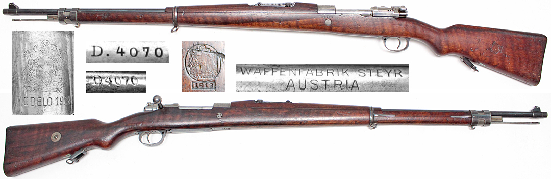 CHILEAN Model 1912 Mauser bolt-action infantry rifle # D4070 (7x57mm) mfg. by Waffenfabrik Steyr in 1912. Very Good condition, with 80% bluing (less on barrel-bands, receiver "in the white" as is proper) and a strong mirror-bright bore. All serialized parts matching except cleaning rod. Tigerstriped walnut stock has original finish with many handling marks from actual service use, strong 1912-dated cartouche on left side. Not import-marked. PHOTOS . . . . $650.* C&R