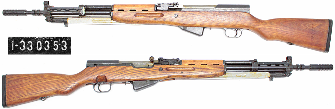 YUGOSLAVIAN Model 1959/66 A1 SKS semiautomatic rifle # I-330353 (7.62x39) mfg. by Zastava in 1972. Excellent-PLUS condition, with 99% or better bluing, perfect bore and all-matching serial numbers with integral bayonet. Has non-ported grenade-launcher and flip-up night-sights. Wood is beech and looks new with no dings or scratches. Much remaining cosmoline on metal and wood. Includes cleaning-rod, a basically unissued example! PHOTOS . . . $895. C&R SOLD