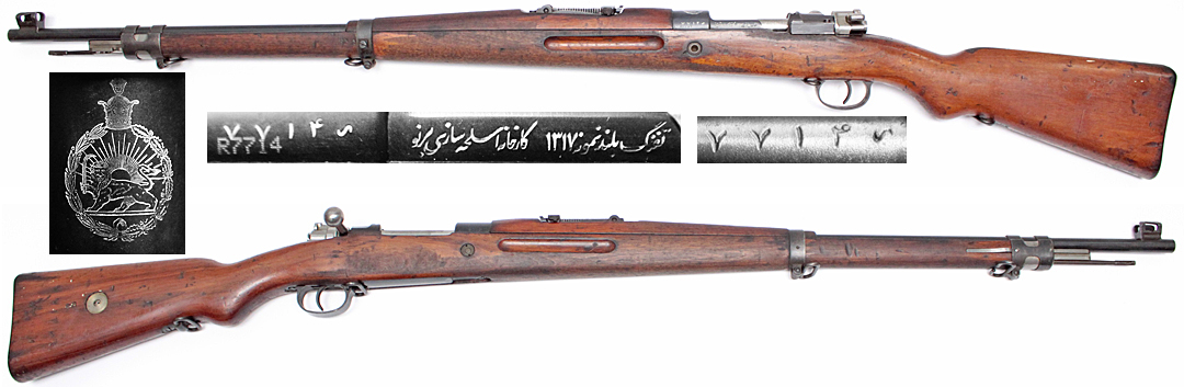 PERSIAN Model 98/29 rifle # R7714 (8x57) mfg. by Brno in 1939 (1317 Anno Hijera). Near Excellent condition, with all-matching serial numbers. Internally perfect with a mirror-perfect bore. Wood is walnut and is sound but with many scrapes and dings in the finish (one of SAMCO's "B-Grades"). Not pretty at all (but could be made to be with a little effort and skill).
