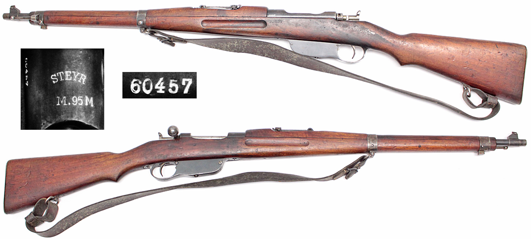 YUGOSLAVIAN Model M95M Mannlicher straight-pull short rifle # 60457 (8x57mm), made by Steyr (undated). Near Excellent condition, with 90% or better bluing and a mirror-bright bore with very sharp rifling. All matching numbers except bolt handle (as usual), stock also stamped to match. Wood has many dings and handling marks, extractor and internal magazine clip present. Not import-marked, extremely scarce. PHOTO . . . $675. C&R SOLD