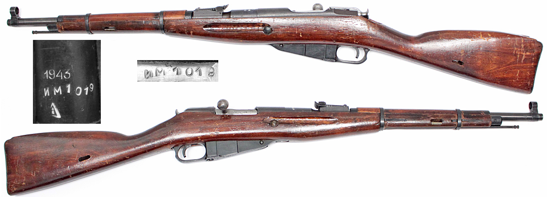 SOVIET Model 38 Mosin-Nagant bolt-action carbine # IM1019 (7.62x54R) mfg. by Izhevsk in 1943. Excellent arsenal refinished condition, with full bluing on all metal parts. All matching STAMPED serial serial numbers (with letter prefixes). Bore is mirror-bright (has NOT been counterbored at muzzle). M-38 buttstock (without bayonet groove) has quite a few minor handling marks (mostly in shellac finish), includes cleaning rod. PHOTOS . . . $475. C&R