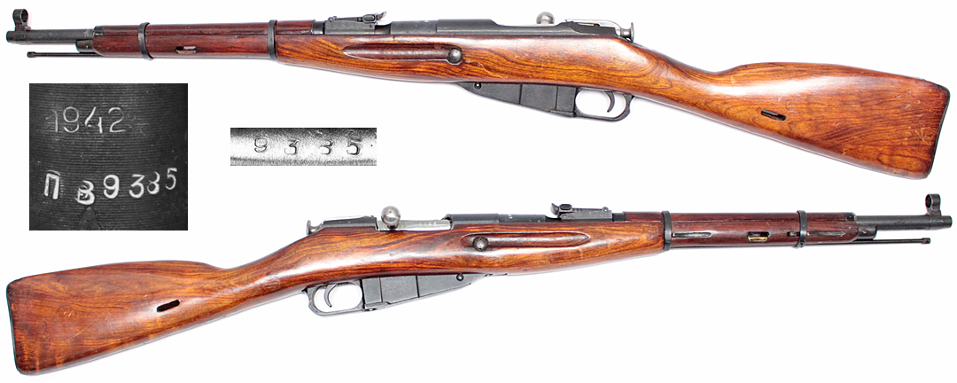 SOVIET Model 38 Mosin-Nagant bolt-action carbine # PB9385 (7.62x54R) mfg. by Izhevsk in 1942. Excellent arsenal refinished condition, with 96% or better bluing on all metal parts. All matching STAMPED serial serial numbers (without letter prefixes). Bore is somewhat bright with strong rifling (has been counterbored at muzzle). M-38 buttstock (without bayonet groove) has very few minor handling marks (mostly in shellac finish), includes cleaning rod. PHOTOS . . . $475. C&R SOLD