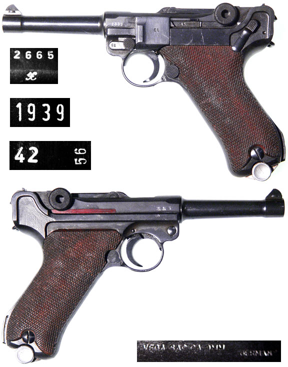 GERMAN Model P-08 semiautomatic Luger pistol # 2665x (9mm Parabellum) mfg. by Mauser in 1939. Excellent condition, all markings very clear and bold, but is actually a composite of two different pistols, the slide and frame components # 2665 has all-matching numbers, the toggle and sideplate numbered 56. Bore has much rifling but kinda dark. Really nice checkered walnut grips without chips or cracks. This Luger is functional and very tight, very tiny import-mark (VEGA SAC CA) on bottom of right side. PHOTOS . . . $800. C&R SOLD