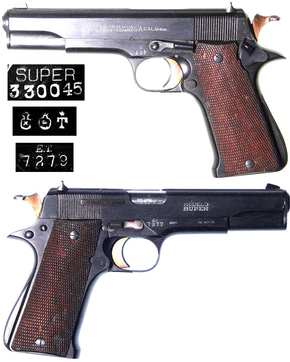 SPANISH Model SUPER semiautomatic pistol 330045 (9mm Largo), mfg. by Star in 1947. Excellent-PLUS condition with 95% or more bluing with very vivid "straw" color on hammer, trigger & extractor. Has a strong and bright bore, and literally looks as-new. Includes two magazines and Interarms cardboard box. PHOTO . . . $275. C&R SOLD