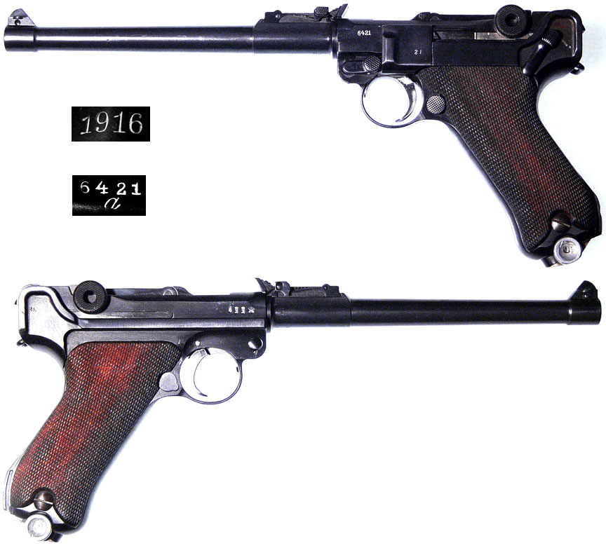 GERMAN Model 1914 Artillery semiautomatic Luger pistol # 6421a (9mm Parabellum) mfg. by DWM in 1916 with tangent rear-sight and 8" barrel. An original all-matching (except for magazine) example which has been nicely reblued. All markings very clear and bold, all small parts numbered 21. Bore has much rifling but is also pitted and dark. Piece is functional though magazine does not hold back toggle on last round. Nice checkered walnut grips has that small chip on left side near safety. Not import-marked. PHOTOS . . . $1500. C&R