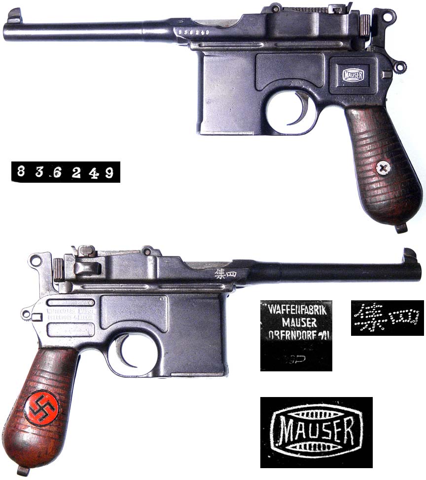 GERMAN Model 1930 Broomhandle semiautomatic pistol # 836249 (barrel apparently sleeved and rechambered to 9mm) with 5.5" barrel, mfg. at Mauser circa 1935. Near Excellent condition, with nearly full bluing. Near perfect bore with little sign of use. All markings bold with two Chinese characters pinged into right side of slide. Right grip has red swastika medallion set into center. Action is smooth and pistol has obviously seen some use but is quite attractive. Not import-marked. PHOTO. . . $750. C&R SOLD