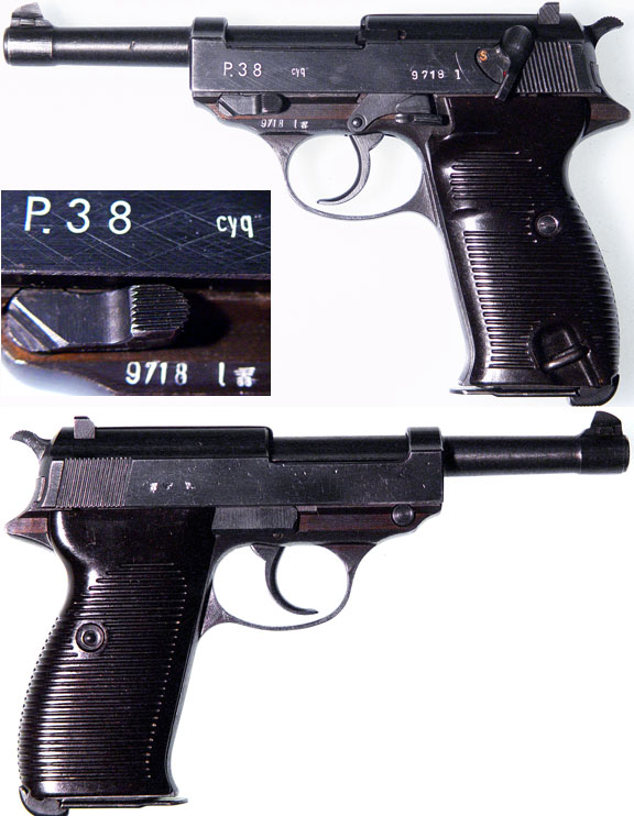 GERMAN Model P-38 Walther semiautomatic pistol # 9718L (9mm Parabellum) mfg. at Spreewerke (Nazi code cyq) in February 1944. Excellent condition, with over 95% bluing with strong and mirror-bright bore. All-matching numbers, strong markings, includes one eight-round E/88 marked magazine. Not import-marked, definitely a bringback, as there is someone's Social Security # scratched on bottom rail of slide (cannot be seen unless disassembled). PHOTOS . . . $750. C&R SOLD